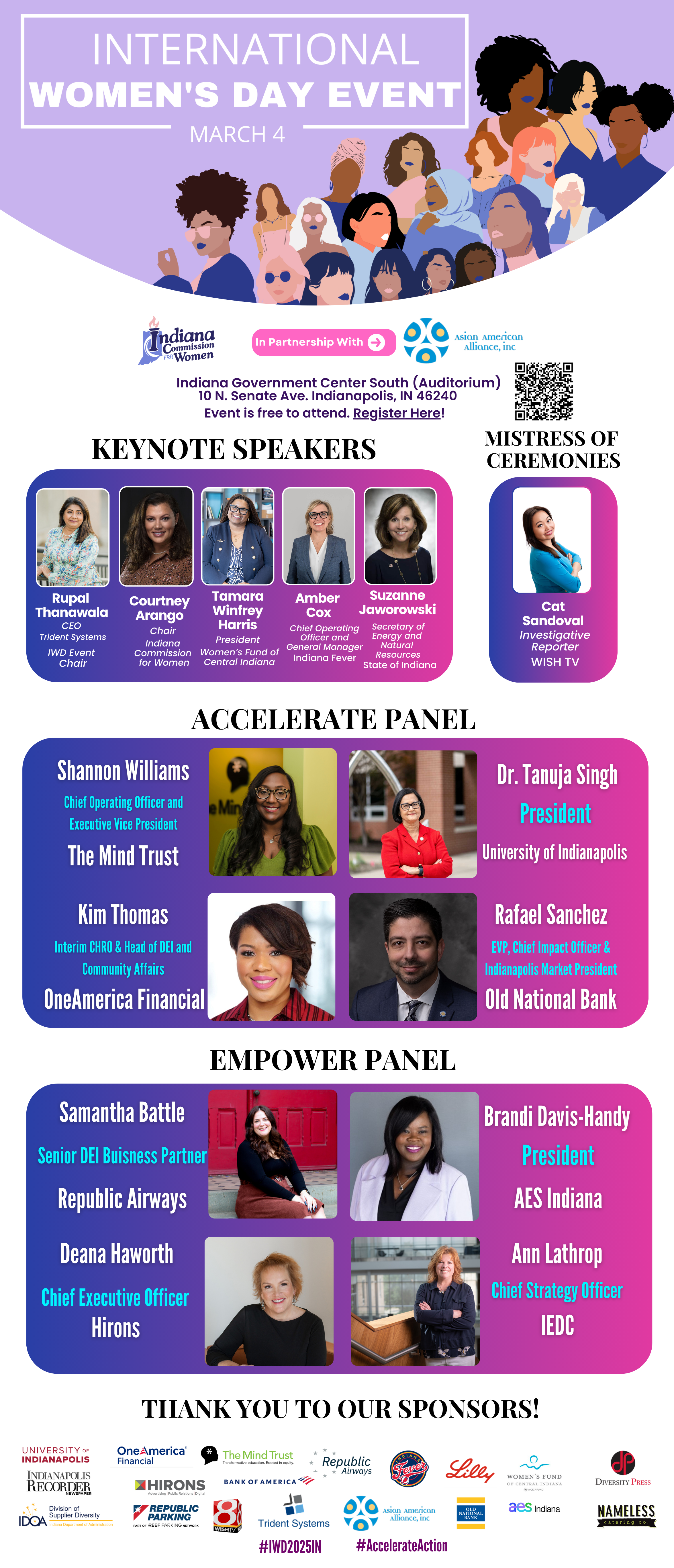 Presented by Event Chair Rupal Thanawala, the Indiana Commission for Women will host the International Women's Day event for 2025! International Women’s Day (IWD) is a global day celebrating the social, economic, cultural, and political achievements of women. The 2025 IWD campaign theme, #AccelerateAction, will center on strategies designed to promote women's advancement. Seize this opportunity to connect, be inspired by dynamic speakers, and participate in exciting activities! Join the celebration and help drive action for women's empowerment!