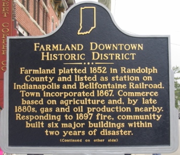 Farmland platted 1852 in Randolph County(1) and listed as station on Indianapolis and Bellfontaine Railroad.(2) Town incorporated 1867.(3) Commerce based on agriculture(4) and, by late 1880s, gas and oil production nearby.(5) Responding to 1897 fire, (6) community built six major buildings within two years of disaster.(7)
