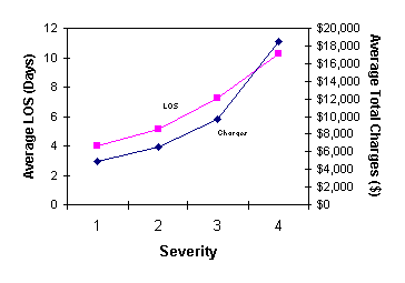Severity: Each consolidated APR-DRG is subdivided into four subclasses based on the complexity level of the secondary diagnosis and the interaction between it and other factors such as age, procedures, etc. The scale ranges from 1 to 4 with 1 = minor, 2 = moderate, 3 = major and 4 = extreme. Patients with higher severity scores will usually require longer lengths of stay, consume greater resources and hence incur higher total charges. (See the figure below for an example.)