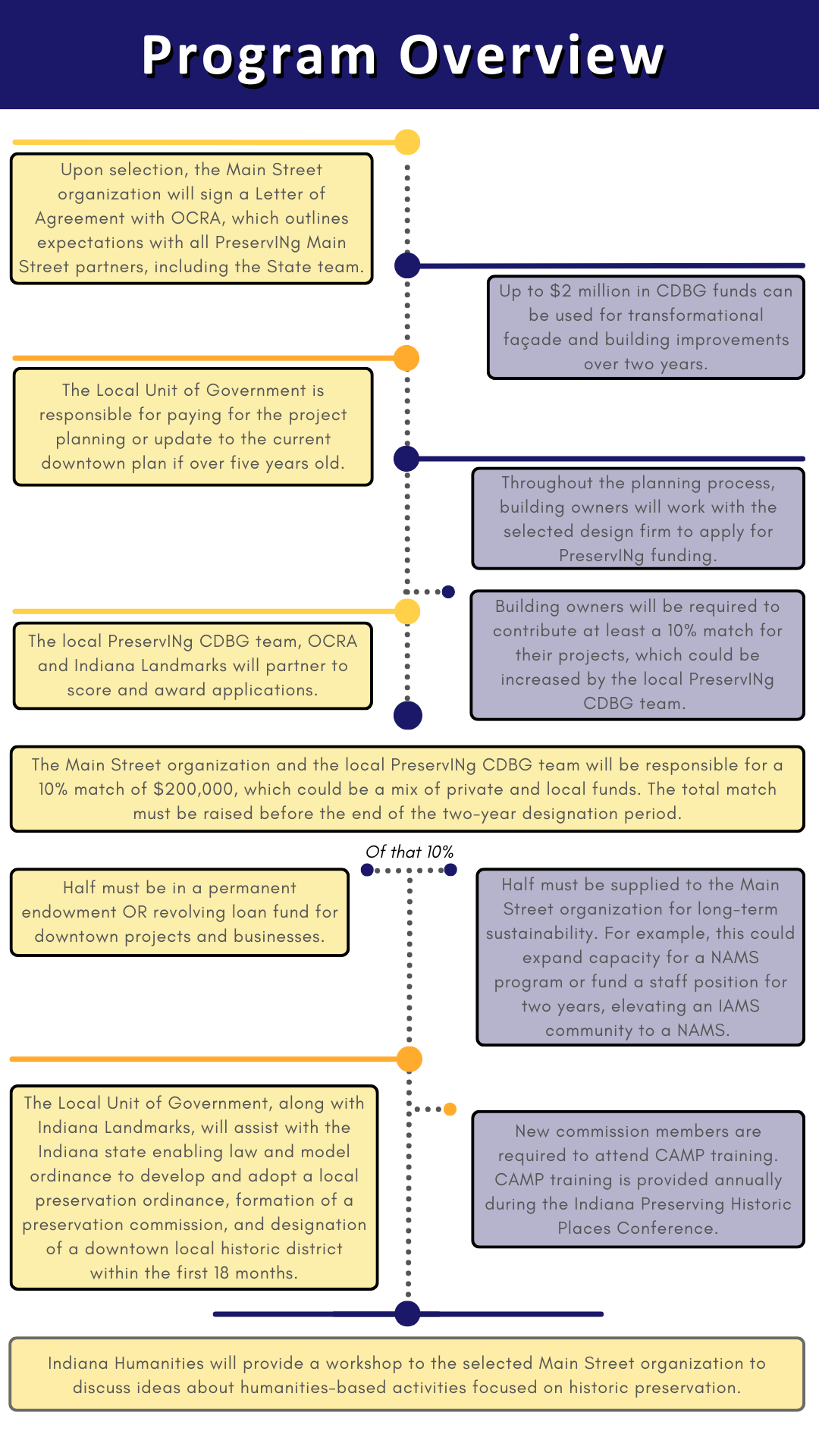 This program is funded through the State’s CDBG allocation. The community will need to secure a certified Grant Administrator before the kickoff meeting. Ideally, a grant administrator should be engaged with the applicant prior to the site visit. CDBG funds will be awarded directly to the chosen community’s local unit of government. Communities that are awarded the PreservINg Main Street grant are disqualified from receiving additional CDBG grants until the program is closed out.