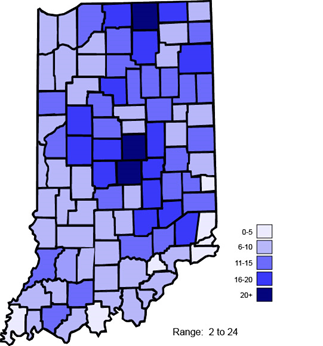 The highest number of veterinarians servicing a single county was 24. This map illustrates what counties have the highest reported number of veterinarians offering services. The veterinary desert areas—which have the fewest practitioners available—is reflected in the lighter areas.