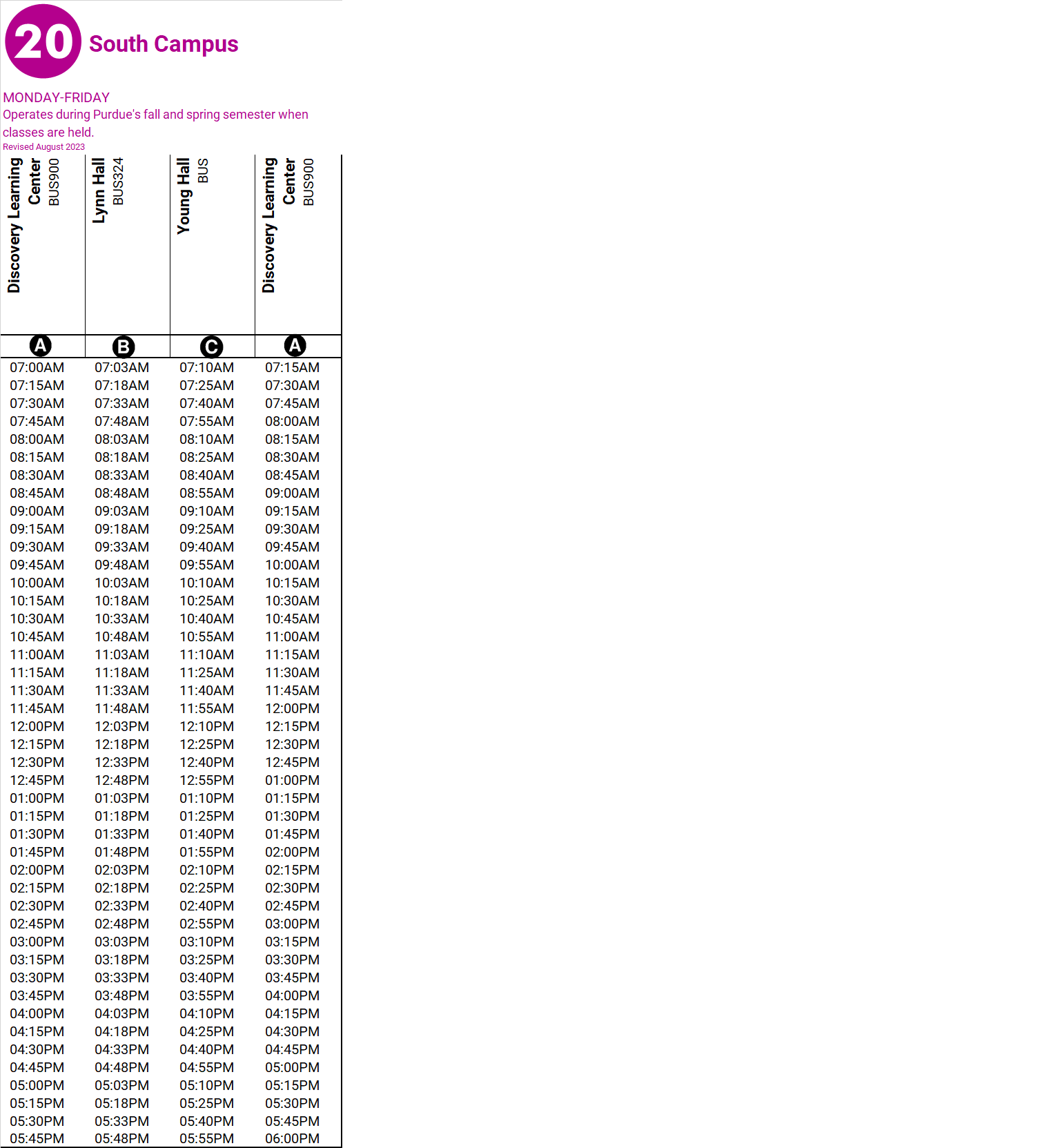 16C Bronze Campus Loop operates Monday through Friday during Purdue’s fall and spring semesters when class is in session. Destinations include Lynn Hall, Discovery Park Lot, Purdue Airport/NISW, and Lyles-Porter Hall. The 16C Bronze Campus Loop route will not operate during the following dates while Purdue University is not in session. |