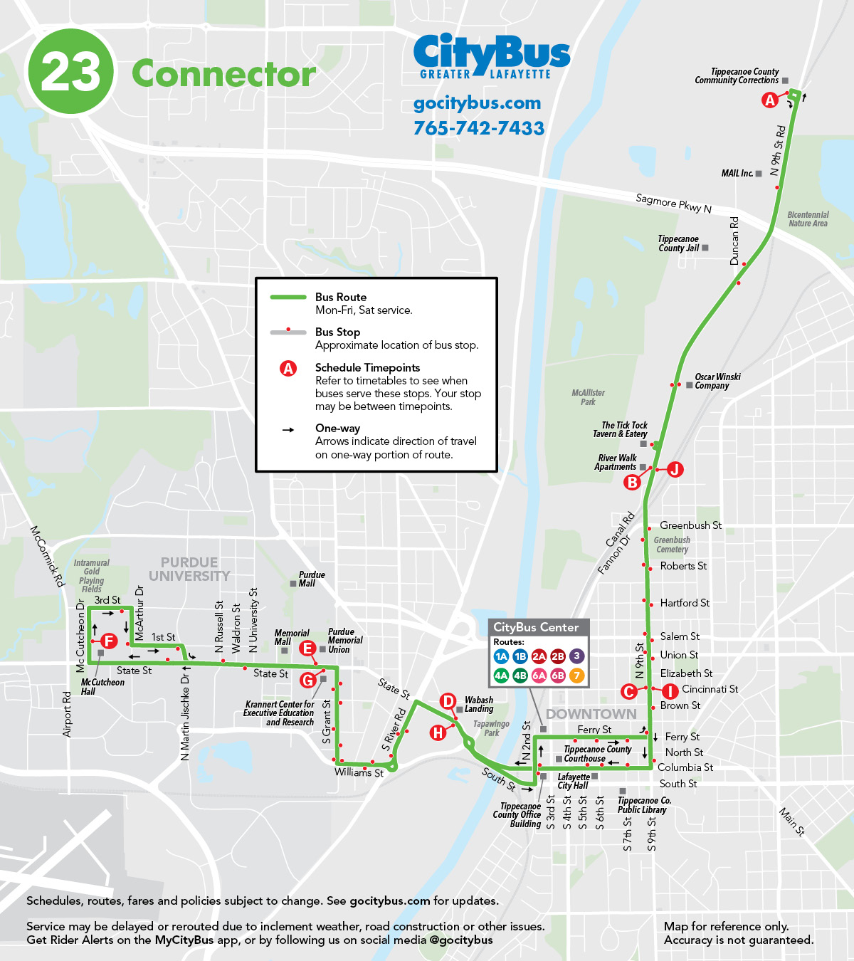 | This route is FREE for all riders, all the time! The 23 The Connector runs Monday-Friday and Saturday. Hop on and discover Purdue University campus, Chauncey Hill shops, and downtown Lafayette’s restaurants, bars, art galleries, and shops, as well as Tippecanoe County Corrections. |
