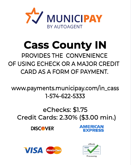 If payments are mailed, they should be sent to Cass County Treasurer, 200 Court Park Room 104, Logansport, IN 46947. Spring payments must be postmarked by May 12, 2025. Fall payments must be postmarked by November 10, 2025. If you are mailing your payment on the last day we strongly suggest that you take the envelope inside the post office and have it hand cancelled. Payments received with a postmark after due dates are subject to penalties. (Meter dates are not acceptable)