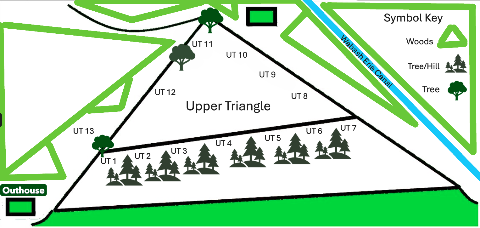 This is a Map of our Primitive Campsites. Primitive campsites are non-reservable, they are on a first-come, first-serve basis. The sites in the Upper Triangle (UT1, UT2, etc.) have electric hookups. The primitive campsites are currently under renovation, so their locations are not exact, but this will give you a general idea of what is available.