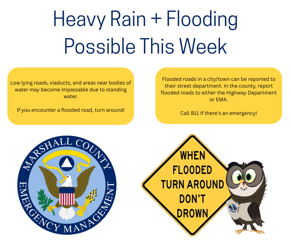 EMA is monitoring the chance for heavy rainfall and flooding this week. At this time, flash flooding seems to be a greater concern than widespread river flooding. Low-lying areas, especially those next to bodies of water, will be more vulnerable. Please remember to TURN AROUND if you encounter a flooded road! Report flooding to EMA by clicking HERE.