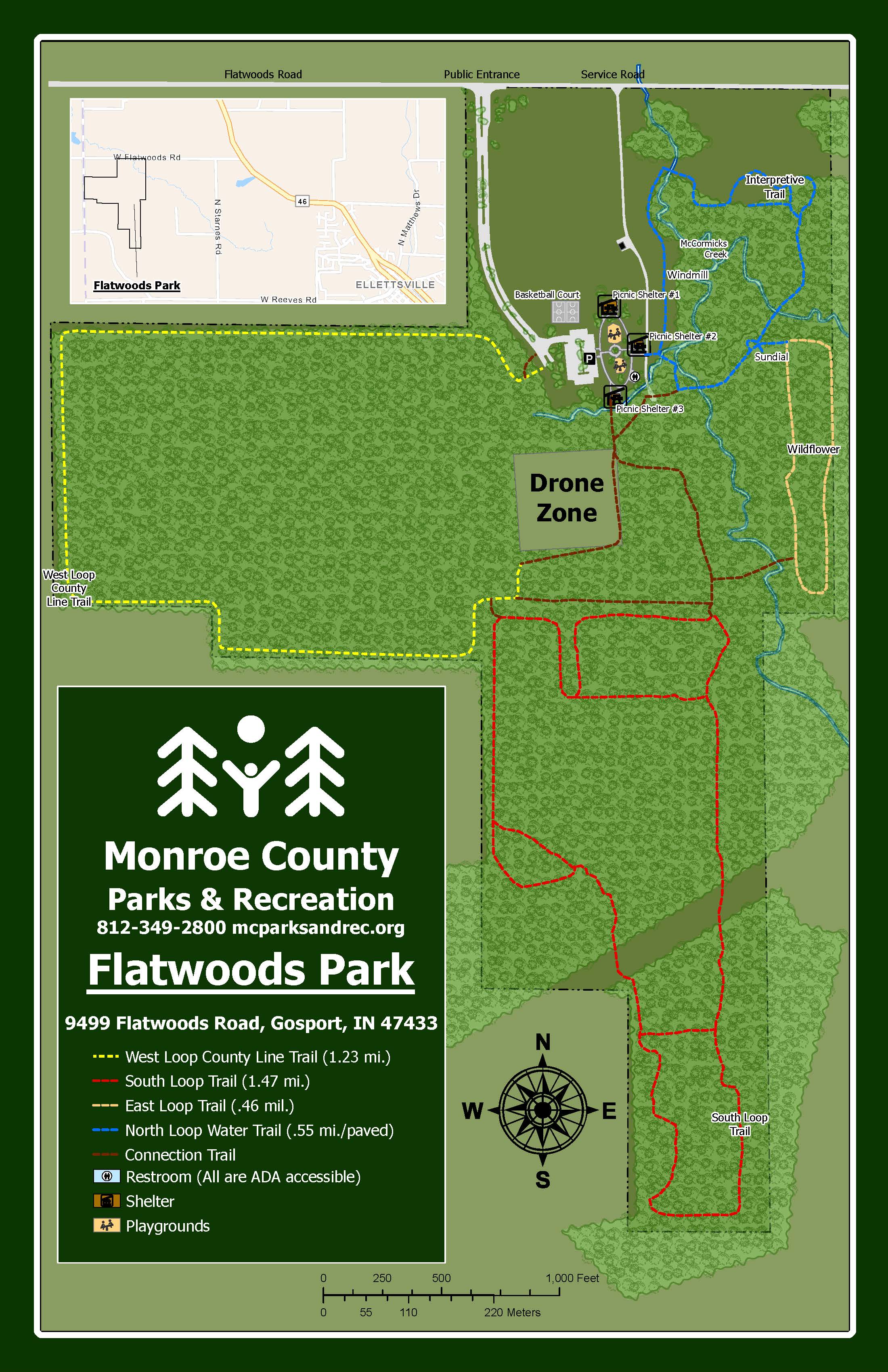 The name of Flatwoods Park derives from the local name for the area, which was formed by glaciers 10,000 years ago. The blocked water drained into the White River, which eventually drained via McCormick’s Creek and caused the collapse of the cave that became the canyon in the state park. The deposited sediment, layers of clay and sand, accumulated to depths of 70 feet and the water table is very high, precluding many possible uses of the land at Flatwoods. The park has an artesian well and several springs. A seven-mile paved loop serves as a multi-use, interpretive trail, which uses the theme of water to explain the geology, formation, and history of the park land. The old fields are used by butterflies, nesting grassland birds and other species that use early successional areas. Many birdwatchers visit the park to seek out the flora and fauna. The intermittent streams are used for water quality studies and a weather station, sundial, and windmill are also used for educational field trips and special event days.