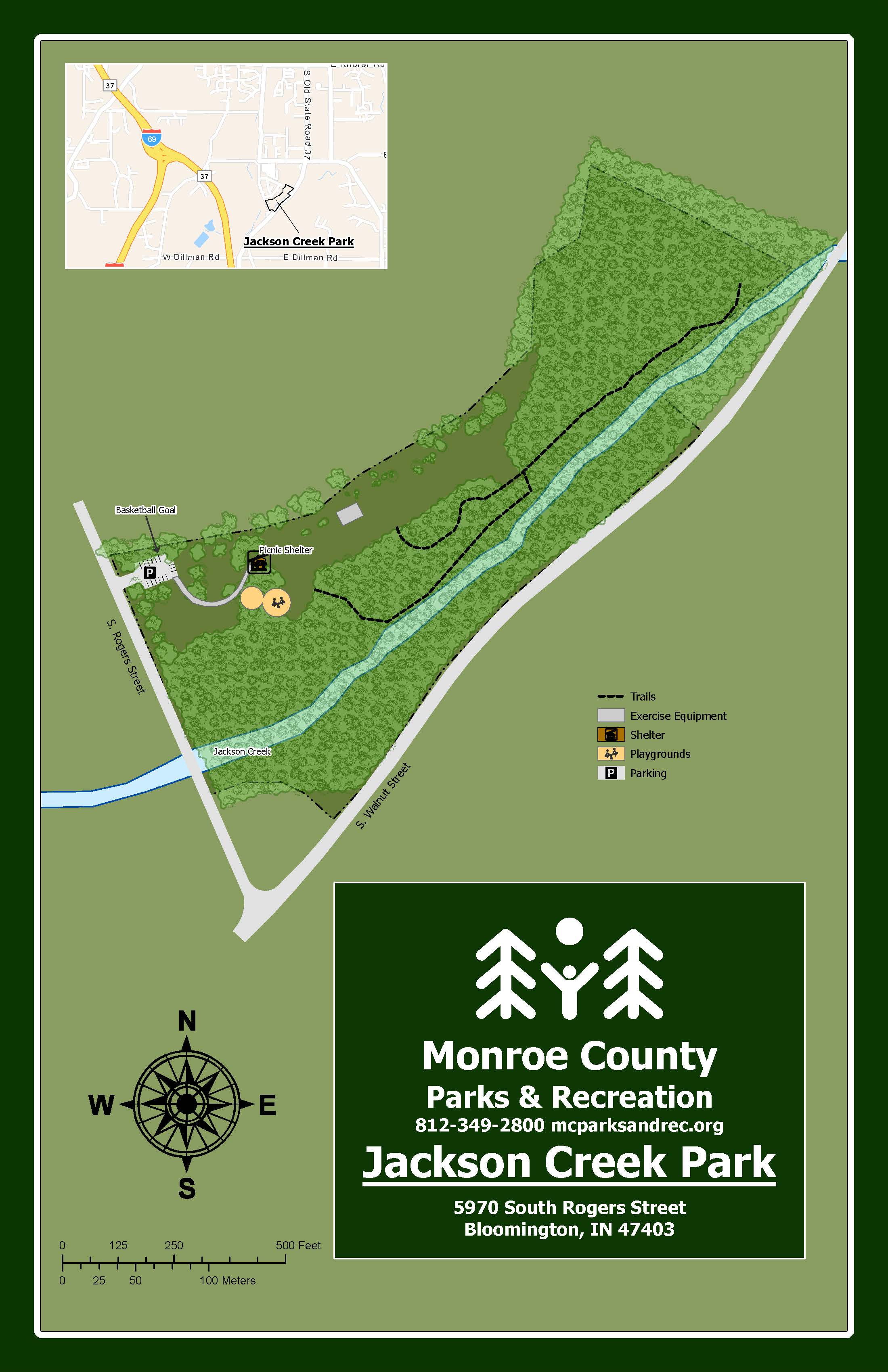 Jackson Creek Park is located along Jackson creek, which is part of the watershed draining the west side of Bloomington. Because it is located in a floodplain, there are limits to construction and some uses of the property. That being said, it does contain a small playground, shelter, half basketball court, and a small trail, which runs along the edge of Jackson Creek. Part of the park preserves the riparian corridor to improve water quality.