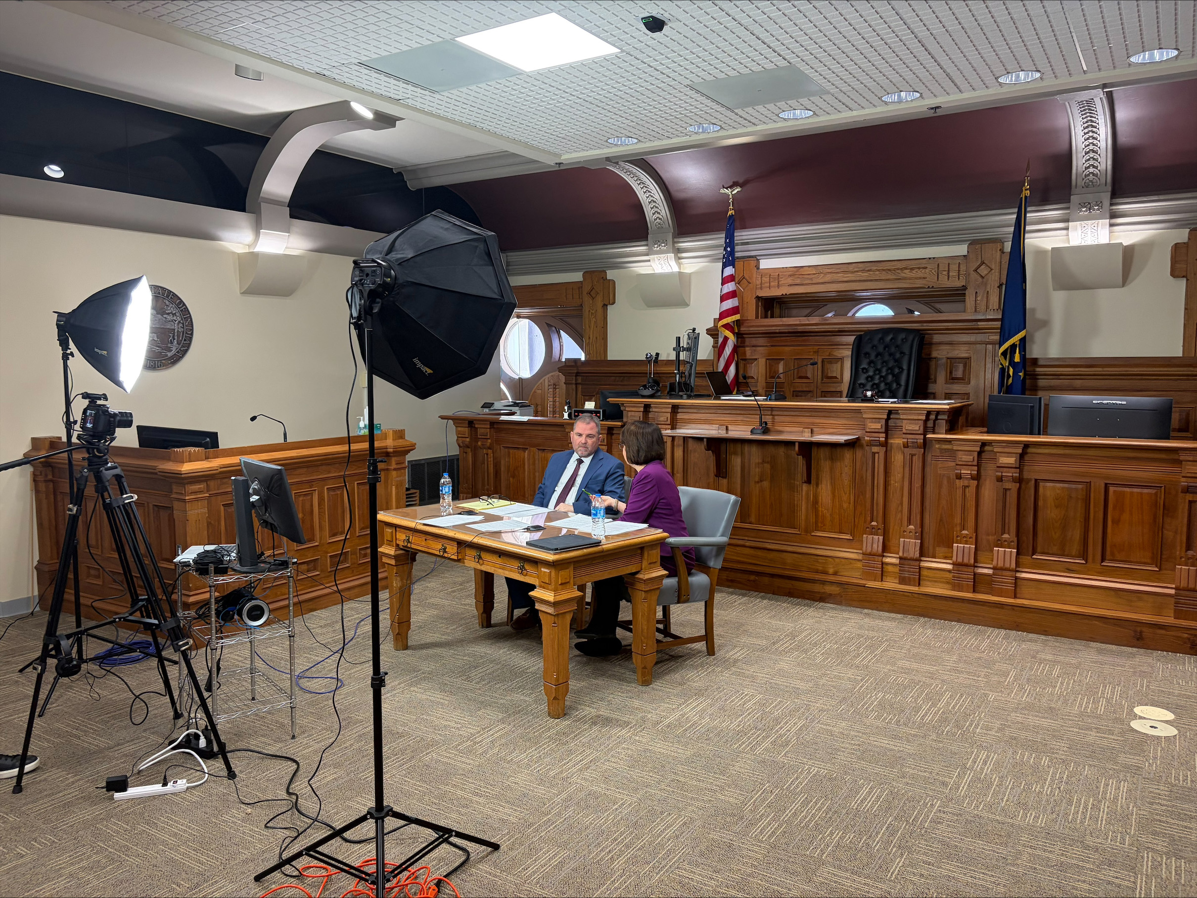 The following photograph and video clip are from a webinar hosted by Chief Justice Loretta Rush on January 23, 2026. The topic of the webinar was court security in the wake of the recent shooting of Judge Steven Meyer and his wife. Tippecanoe Judge Sean Persin also appears in the video, filmed in Judge Meyer's courtroom in Lafayette, Indiana. This clip is made available to the public as a courtesy.