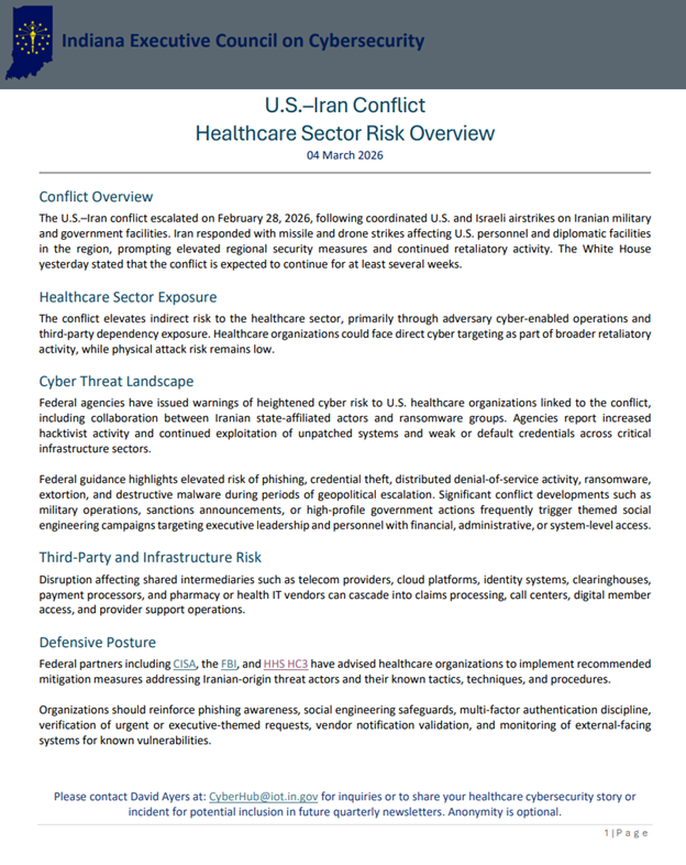 In the wake of the U.S.-Iran conflict, the indirect risk to the healthcare sector is elevated -- primarily through adversary cyber-enabled operations and third-party dependency exposure. Taking into account the threats posed by Iranian state-affiliated groups is among the information featured in a newsletter, published by the Healthcare Committee of the Indiana Executive Council on Cybersecurity (IECC).