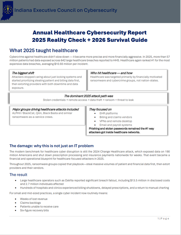 The Indiana Executive Council on Cybersecurity's Healthcare Committee is comprised of experts from across the Hoosier State, whose collective experience is dialed into finding solutions aimed at protecting hospitals and healthcare providers, their staffs and the patients they care for.
