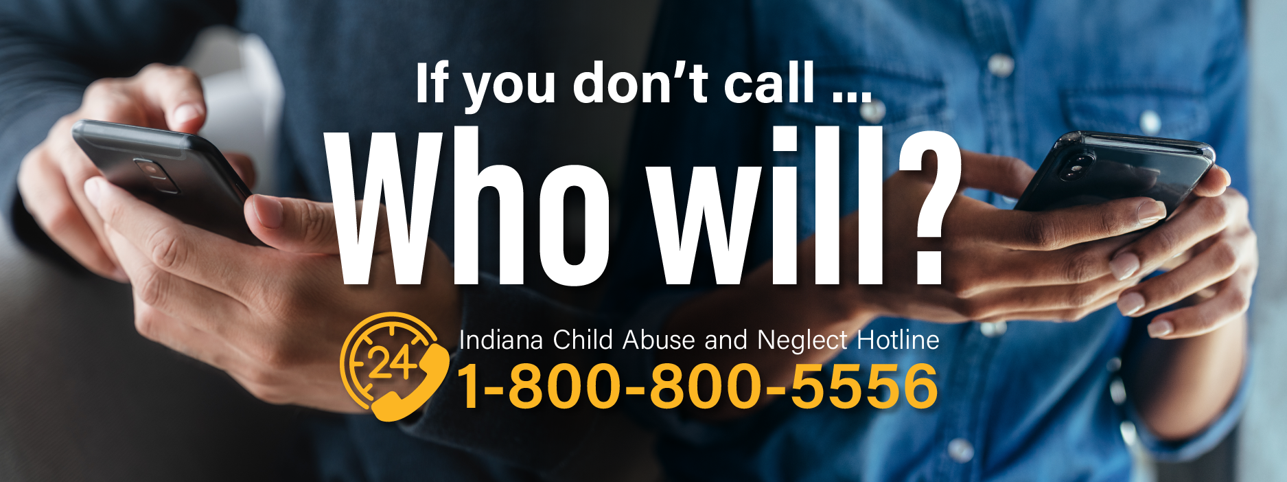 If you suspect a child is being abused or neglected, call the Indiana Department of Child Services' Child Abuse and Neglect Hotline today. It is available 24 hours a day, 7 days a week, including weekends and holidays. You can report abuse and neglect anonymously.