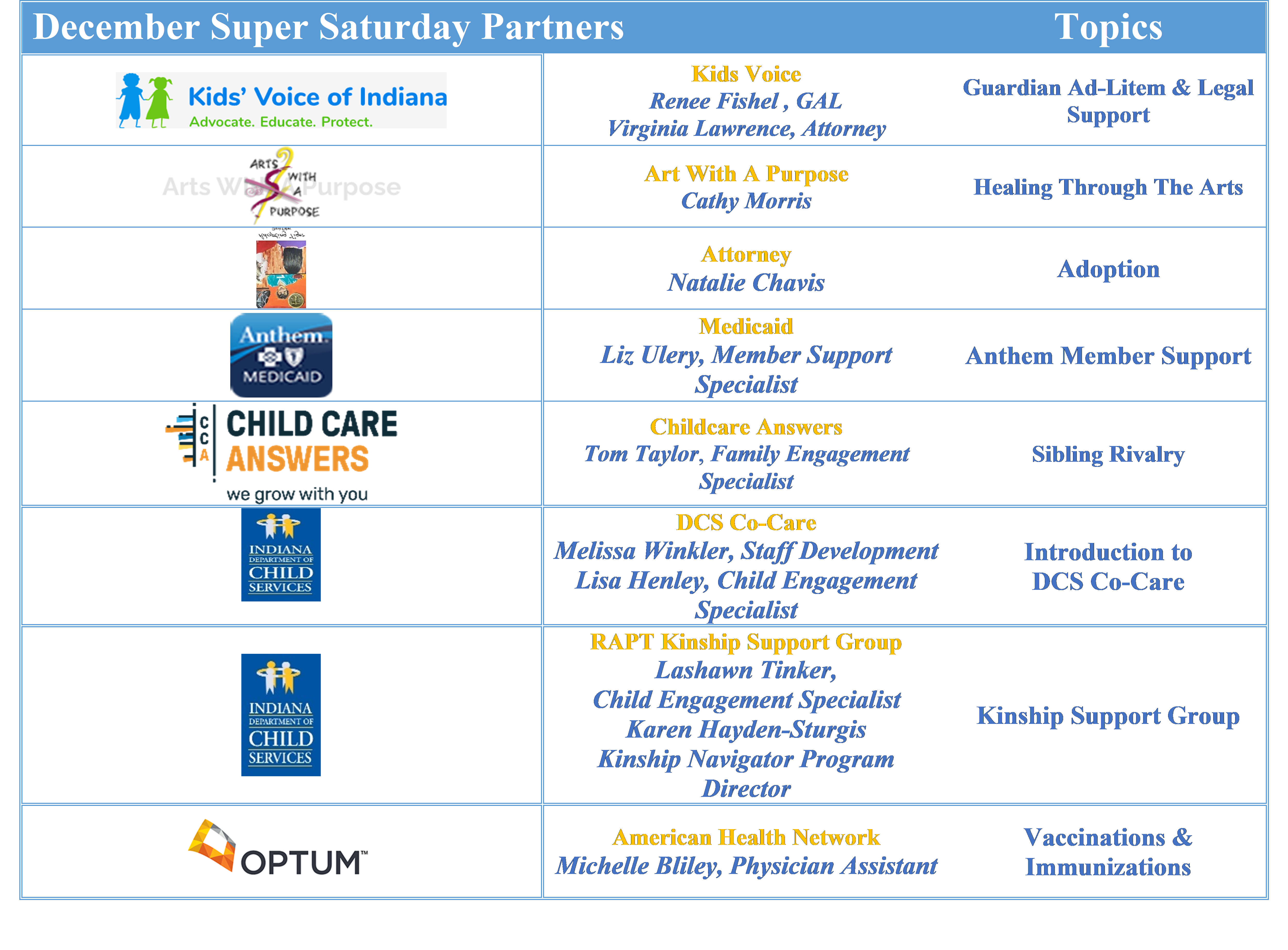 Since the launch of Super Saturday, the RAPT Division has partnered with several community/state agencies, and DCS support divisions to cover topics to support resource families! Presenters have shared their expert knowledge on several subject matters as well as provided resources for families to incorporate in their home.