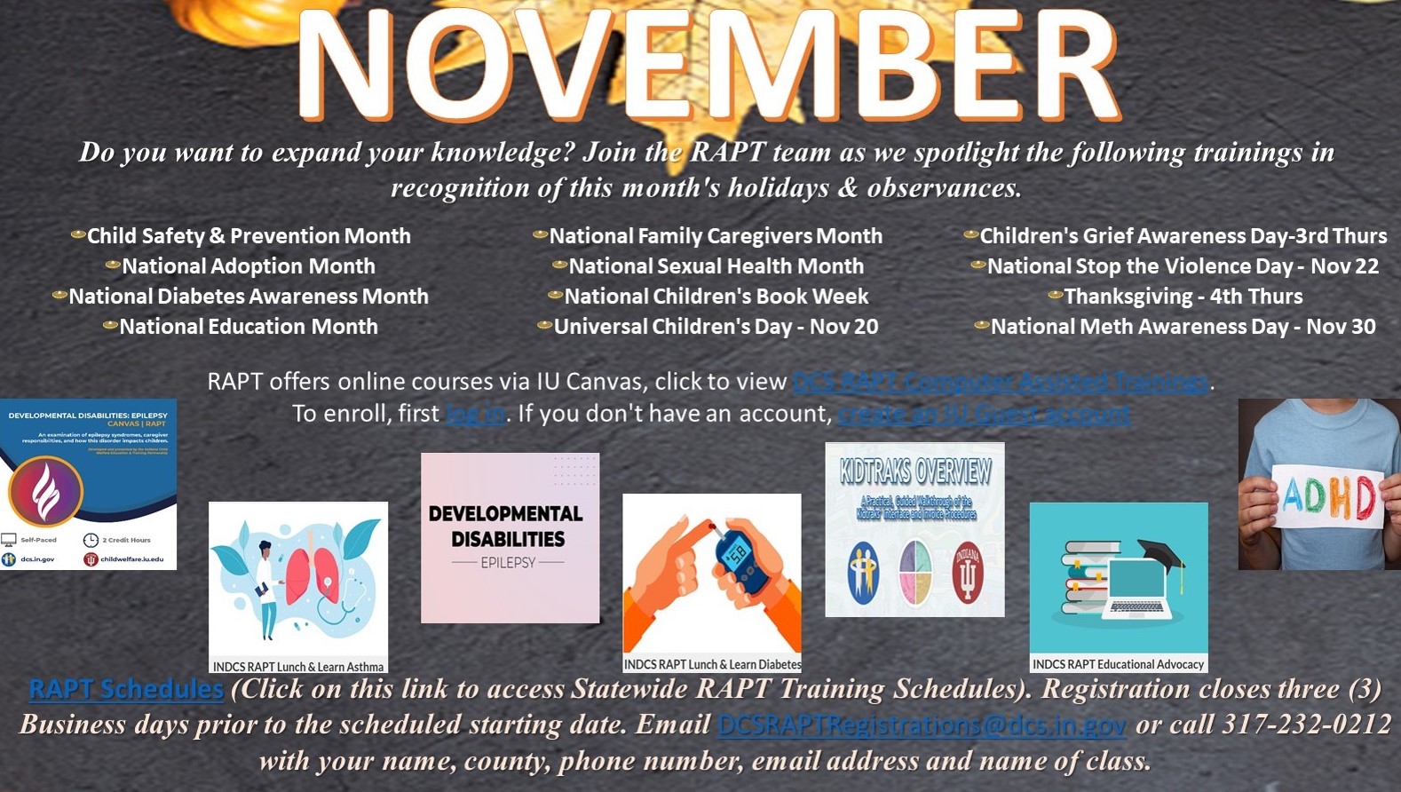 DCS RAPT Super Saturday consists of a three-hour session with recurring and new speakers/topics. Super Saturday provides additional opportunities for information, learning and resources for those fostering/adopting as well as those considering such. It is voluntary and no registration is required. Participants may receive up to three training hours depending on the number of hours attended. Super Saturday occurs at 10 a.m. to 1 p.m. on every third Saturday. Participant can log in as early as 9:30 a.m. The sessions will be held on Microsoft Teams.