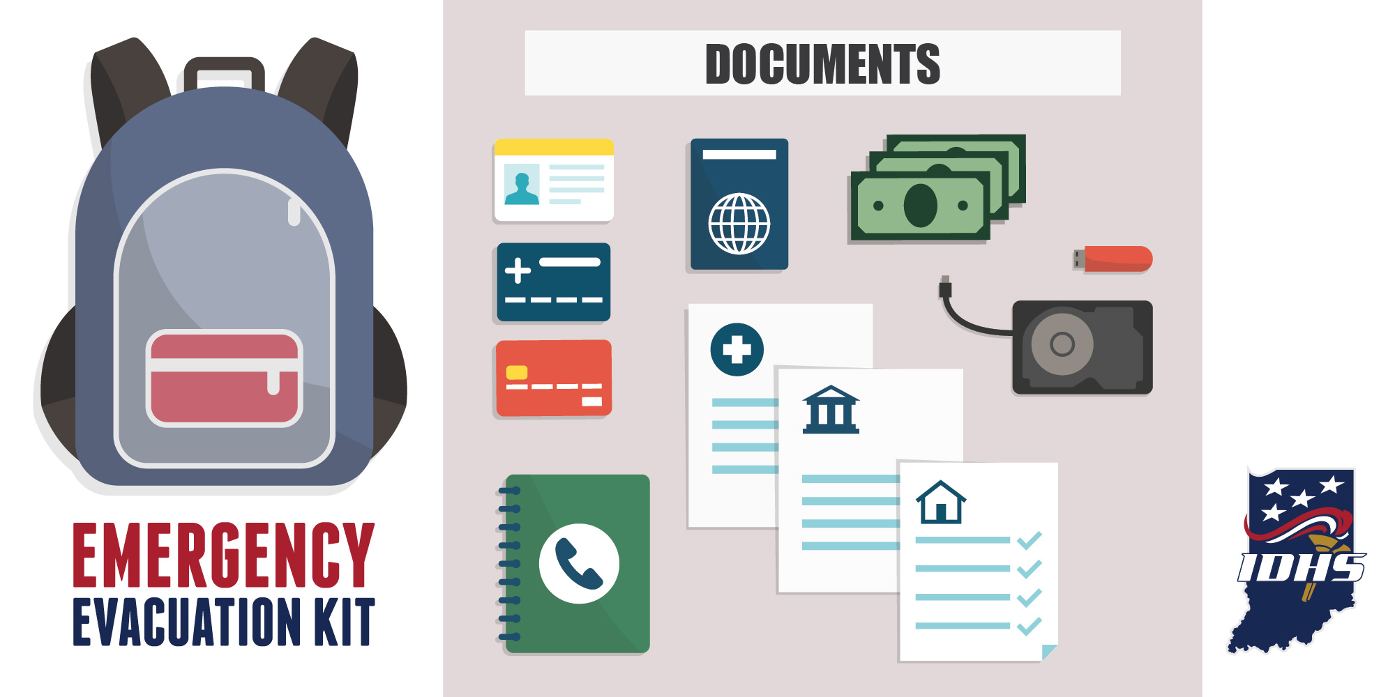 The Indiana Department of Homeland Security wants you prepared for any disaster that might take place. Take action now to help yourself and your family be more prepared for any emergency. It may take emergency personnel up to three days to reach you; therefore, create disaster kits that are designed for three days. Each kit should include basic items like water, food, a flashlight, a battery-powered radio and a first aid kit.