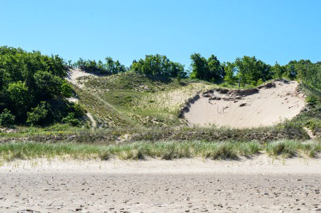The dunes of Indiana, primarily found along the southern shoreline of Lake Michigan, are a unique and dynamic ecosystem. These mounds of sand, some thousands of years old, are formed from materials deposited by glacial meltwaters and are continually reshaped by lake winds. As these dune habitats persist farther south from Lake Michigan, vegetative cover increases and accommodates diverse communities of plants, insects, and wildlife. The dunes include a variety of landscapes, including beaches and dune fields nearer the lake, with grass and woody areas growing on sandy soil farther out. Typical dune animal life includes prairie deer mouse (Peromyscus maniculatus bairdii), herring, and great black-backed species of gulls (Larus agentatus, Larus marinus), and Fowler’s toad (Anaxyrus fowleri). Species of Greatest Conservation Need include endangered plant life like heartleaf willow (Salix cordata) and beach peavine (Lathyrus japonicus). Animal species noted for conservation include rufa red knot (Calidris canutus rufa) and seaside grasshopper (Trimerotropis maritima).