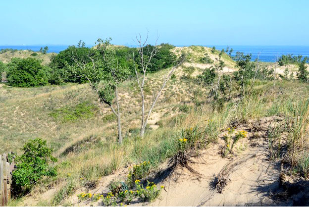 The variety of dune habitats offers a multitude of benefits to Hoosiers and guests. The dunes region is home to many species and ecological communities, including 46 species of mammals, 18 species of amphibians, 23 species of reptiles, 71 species of fish, 60 species of butterflies, and 60 species of dragonflies and damselflies. Some of these species are found nowhere else in the state. Walking and nature trails, as well as the dunes themselves, offer opportunities for recreation. The Indiana dunes region is a national destination for birdwatching, including annual birding festivals. Beyond recreational activities, the landscape of the dunes acts as a geological record for four major stages of historic shoreline development at Lake Michigan. This makes the area a unique case for the study of one of the world’s largest bodies of fresh water.