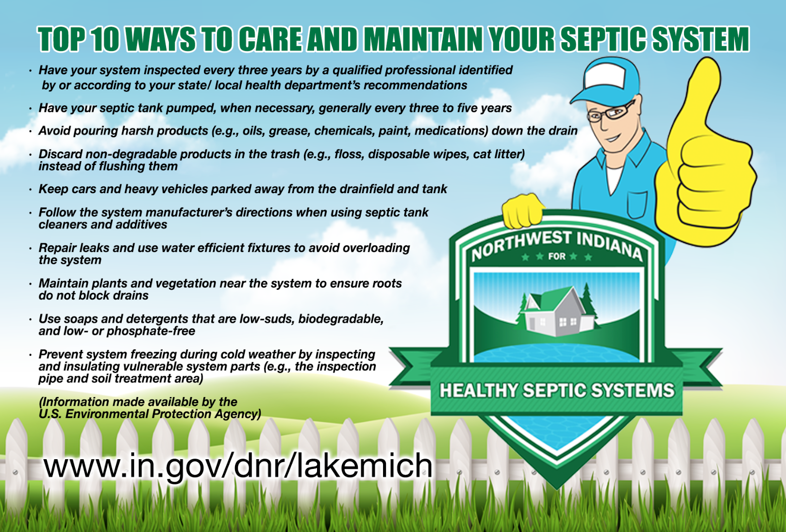The Indiana DNR Lake Michigan Coastal Program and its federal, State, and local partners are participating in the annual EPA SepticSmart Week education and outreach efforts. An estimated 33,033 households across the Indiana Lake Michigan watershed depend on septic systems to treat their wastewater. Failure to maintain a septic system can lead to backups and overflows. This can result in costly repairs, polluted lakes and waterways, and risks to public health and the environment. Don’t fall victim to a failed system.