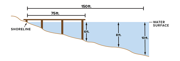 - Where the maximum water depth is not continuously over six feet from the shoreline, the maximum pier length is 150 feet.