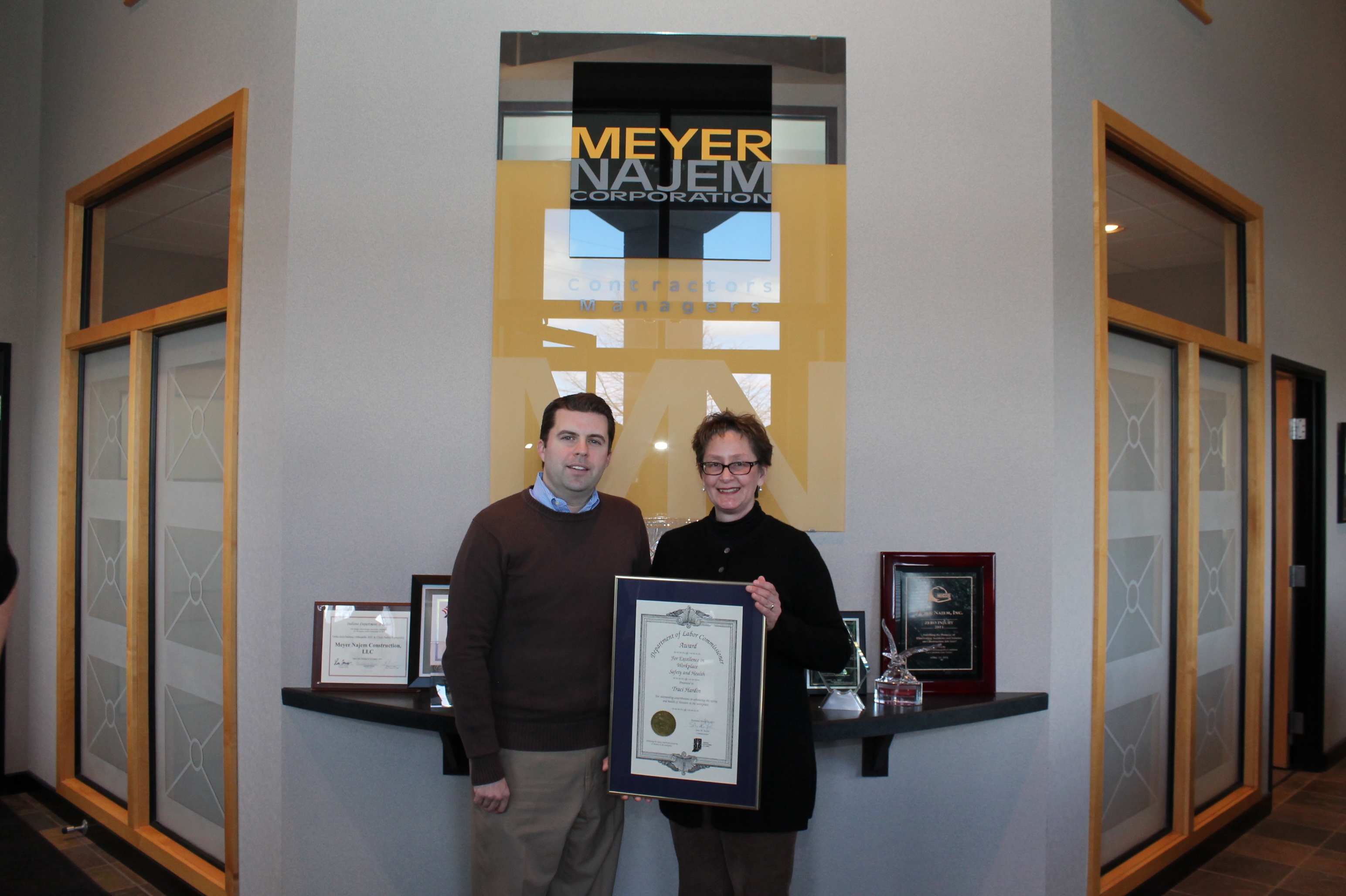 Commissioner of the Indiana Department of Labor Sean M. Keefer presented the first Commissioner's Award of Excellence on Wednesday, March 20, 2013, to Ms. Traci Hardin. Ms. Hardin serves as the Vice President of Safety & Compliance for Fishers-based Meyer Najem Construction, LLC. As the Vice President of Safety & Compliance for Meyer Najem, Ms. Hardin's responsibilities include the management of the company safety program for all projects, human resources, diversity, leadership, training and mentoring. Ms. Hardin is actively involved with the construction industry through the Metro Indianapolis Coalition of Construction Safety (MICCS)–Co-chair MICCS Educational Outreach Committee, Associated Builders and Contractors of Indiana (ABC)–Safety Committee Member, and the National Association of Women in Construction (NAWIC), Indianapolis (Past Chapter President), the American Society of Safety Engineers and the Society of Human Resource Management (SHRM). Ms. Hardin also oversees Meyer Najem's participation in the MICCS Certified Partner/Indiana Department of Labor Partnership and the ABC STEP/Indiana Department of Labor Partnership (ABC STEP Diamond Level Partner).