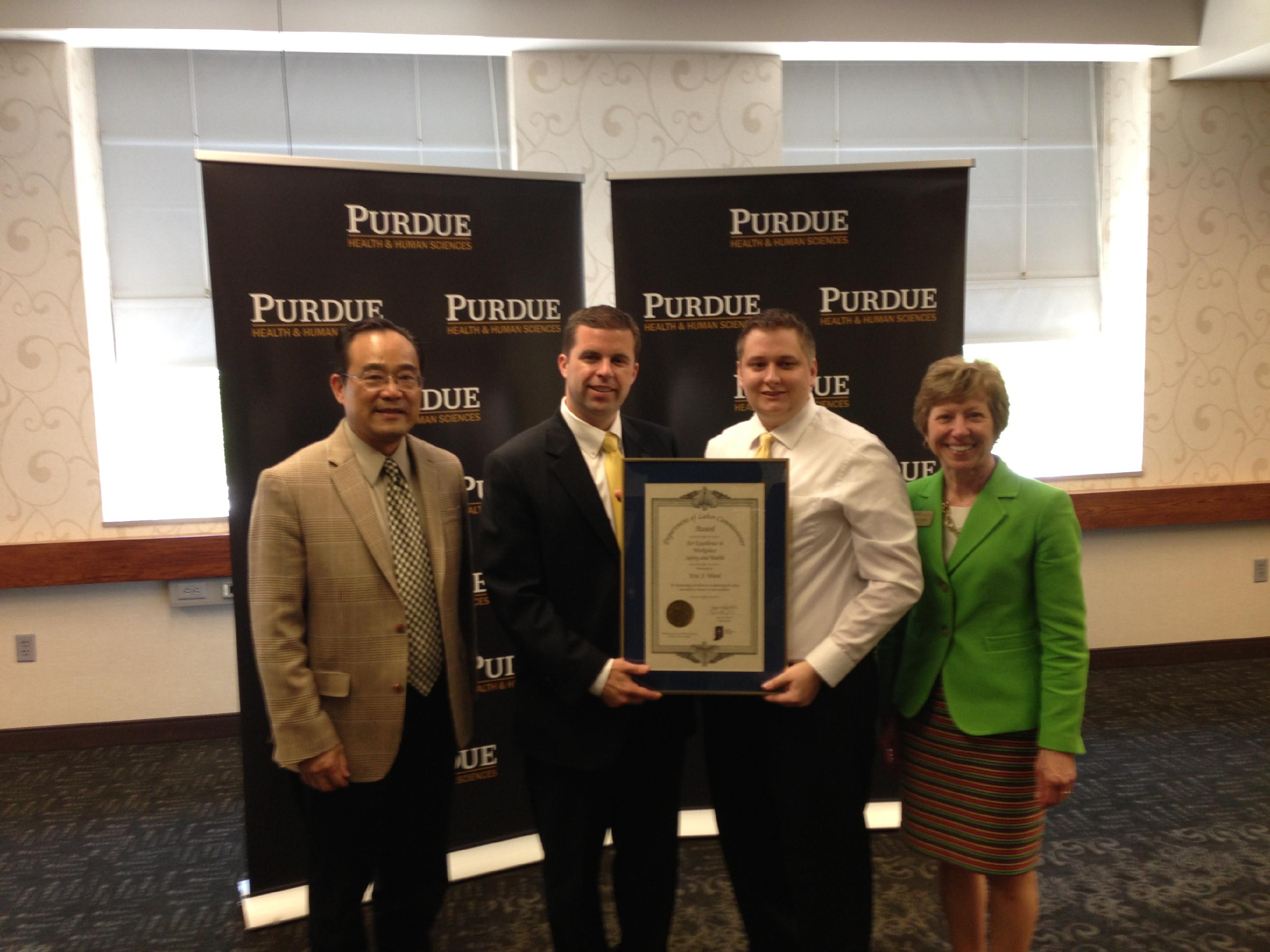 On May 24, 2013, Commissioner of Labor Sean M. Keefer presented the Commissioner's Award of Excellence to Eric J. Ward, a master's degree candidate in the Purdue School of Health Sciences from Plymouth, IN. Mr. Ward developed vest prototypes that could help health and safety inspectors carry their testing equipment more easily and improve ease of using it on the job. Workers can put on the vests by themselves and Velcro straps hold the testing equipment's wires or tubing in place. Counterweights in the front of the vest ensure the equipment located on the back does not pull the vest backward. Mr. Ward has self-funded the development of three vest prototypes he made after returning from a 2012 summer internship. Prototypes of Mr. Ward's designs have been tested by industrial hygiene students at Purdue, and additional tests are in the works with private companies and government agencies in Indiana and Ohio. Mr. Ward will also make a presentation about his vests in Montreal, Quebec, Canada at the 2013 American Industrial Hygiene Conference & Exposition for occupational and environmental health and safety professionals.