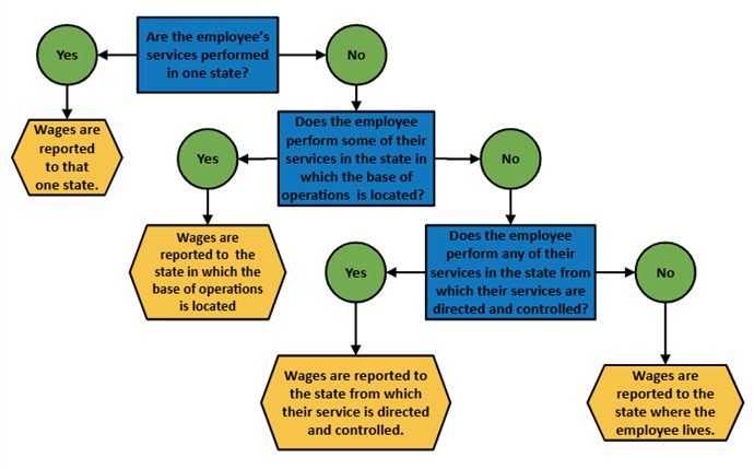 Test 1: Report wages to the state from which the employee has a base of operations if some part of the work is performed in the same state as the base of operations. The base of operations can be a home office, corporate office, regional office, legal address of a sole proprietor, etc. In general, where the worker always starts and ends in the same location, this location is the base of operations. If there is no base of operations, or work is not performed in the same state as the base of operations, go to test 2.