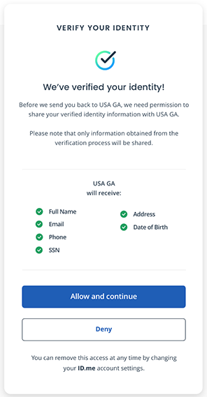Although you will see a message saying that your identity has been successfully verified, you MUST click on “Allow” to complete the process. Clicking on this button allows ID.me to send your information to the Department of Workforce Development who can then grant access to your account.