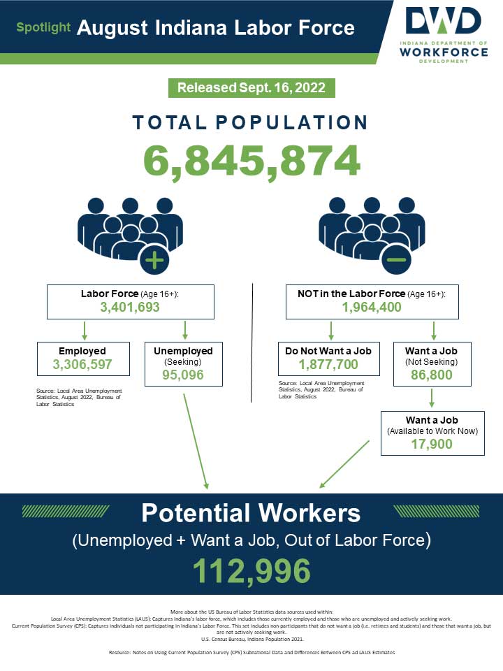 INDIANAPOLIS (Sept. 16, 2022) - Indiana’s unemployment rate in August stands at 2.8%, according to the Indiana Department of Workforce Development. By comparison, the national unemployment rate in August stands at 3.7%, compared to 3.5% in July.