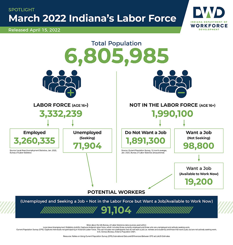 “The latest employment data continues to show a positive trend with Indiana’s labor force,” DWD Commissioner Fred Payne said. “We are encouraged by the increase in private employment and the labor participation rate. This is a great time for those out of the labor force to take advantage of the open job opportunities that could lead to economic mobility.”