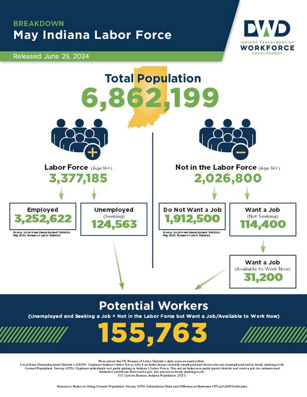 In addition, Indiana’s labor force participation rate stands at 62.4% for May, remaining slightly below the national rate of 62.5%. This rate is the percentage of Hoosiers 16 and older that are either working or actively looking for work. Those not in the labor force include, primarily, students, retirees and other non-working populations, such as individuals unable to work due to a disability or illness, or adults responsible for their family's childcare needs.