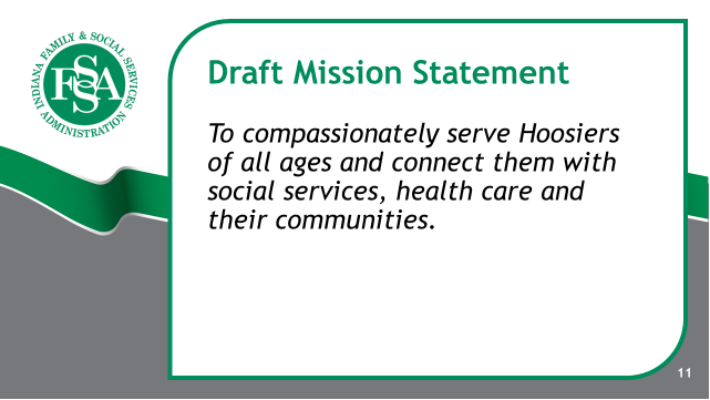 During the presentation, Secretary Walthall asked for staff input on updating the FSSA mission and vision statements. Drafts of the statements are also available below and the current FSSA vision and mission statements are available by clicking here. Questions, comments, and suggestions may be sent to Secretary Walthall at SecOffice.FSSA@fssa.in.gov.