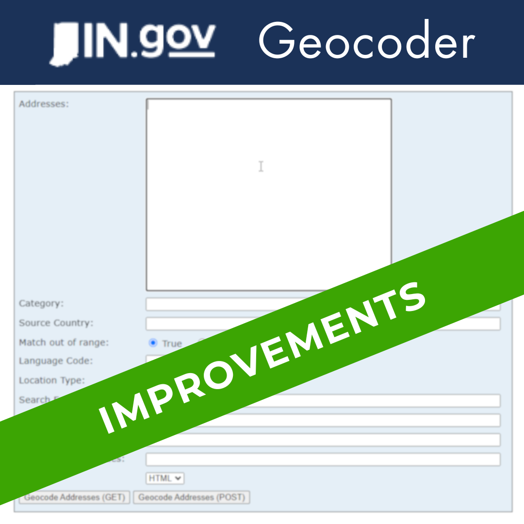 We are committed to continuous improvement in user satisfaction. Given the power of free-to-use statewide geocoder services, improving the accuracy, efficiency, and stability of the geocoder is a high priority for us. As the Data Harvest continues to progress and focus on data standardization and improvement across Indiana, ensuring that improved data quality is integrated into the geocoder is also key.