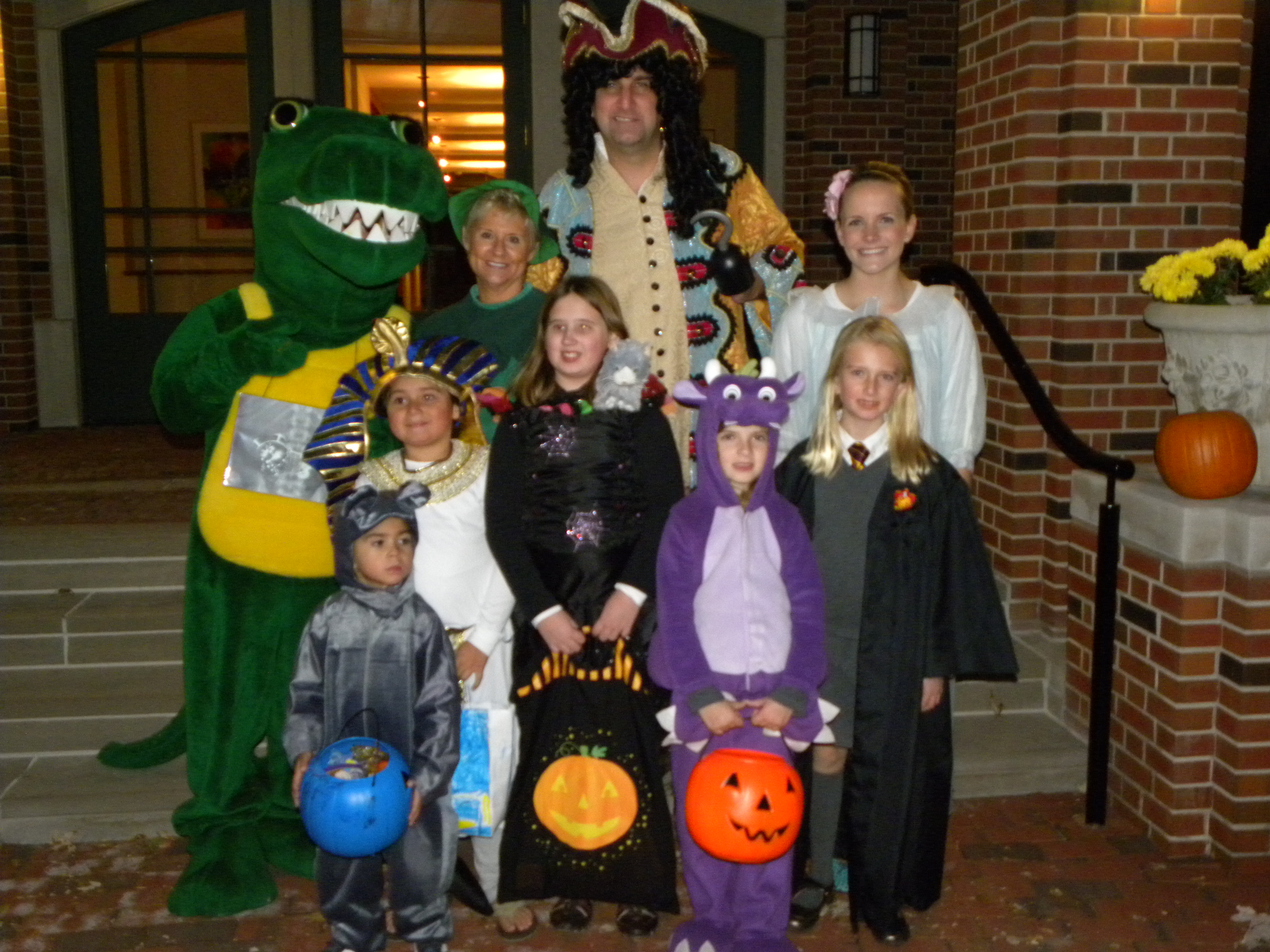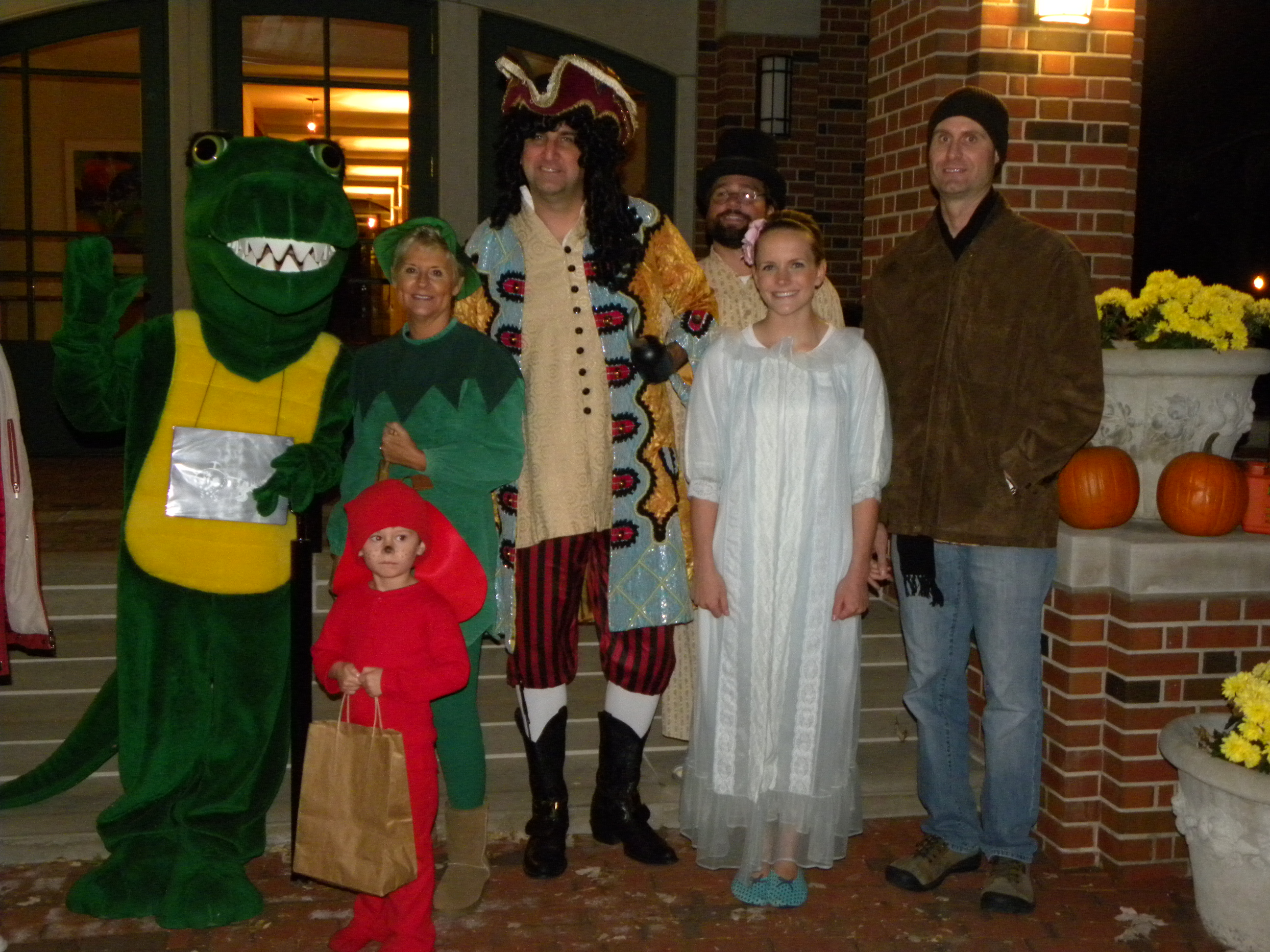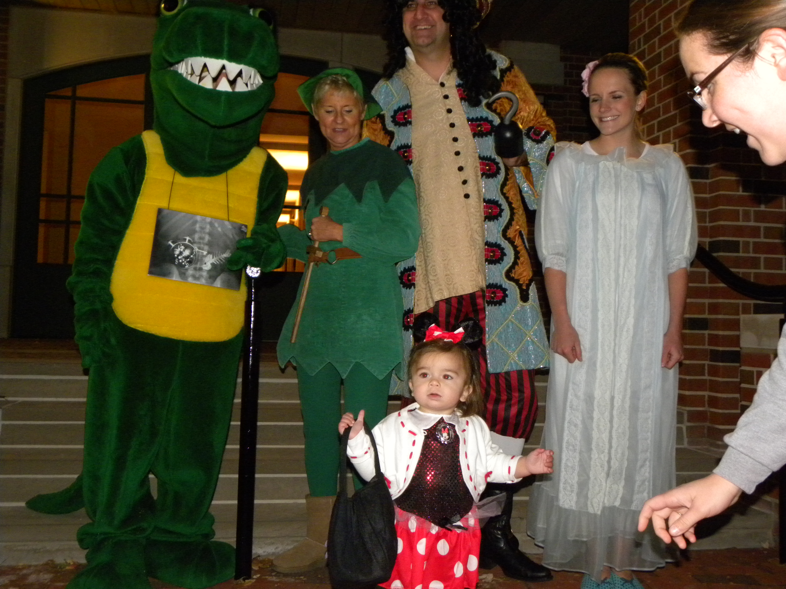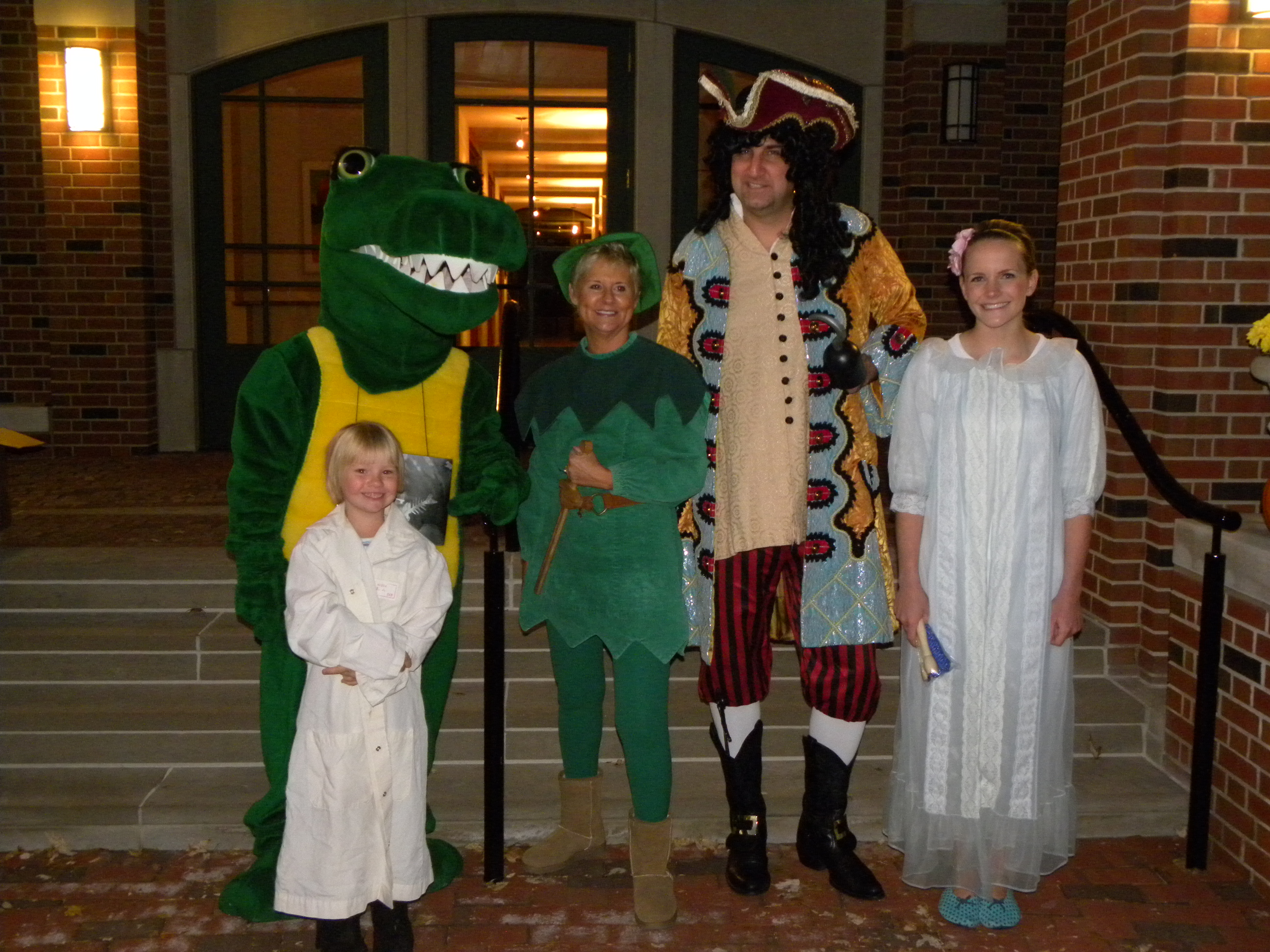 In 2010, Governor Daniels continued the tradition of hosting trick-or-treaters at the Governor’s Residence on Halloween night. Candies made by several Indiana companies were distributed. The governor and his supporting cast dressed as characters from Peter Pan in costumes provided by Landes Costumes by Rachel of Indianapolis. The governor filled the role of the Crocodile. Previous costume themes have been The Wizard of Oz, Pirates of the Caribbean, the Indianapolis 500, the 1950’s and Alice in Wonderland.