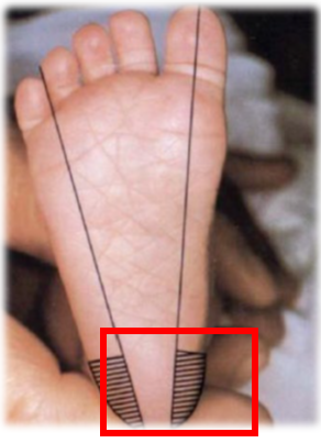 - Stick: Ensure baby’s leg is lower than their heart. Use a lancet that is 1.0mm deep by 2.5mm long for healthy infants. Use a smaller lancet for premature or low birthweight babies. Puncture the heel within the shaded area only!