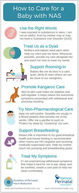 How to Care for a Baby with Neonatal Abstinence Syndrome (NAS) | Information about and appropriate language for dealing with situations in which a baby is experiencing Neonatal Abstinence Syndrome. Sources: Academy of Perinatal Harm Reduction and the National Perinatal Association. |