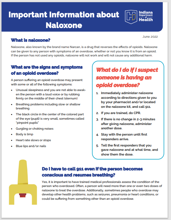 ![]() Important Information About Naloxone | Information on naloxone, how to identify an opioid overdose, what to do in that situation, and more. Source: Division of Trauma and Injury Prevention at the Indiana Department of Health. |