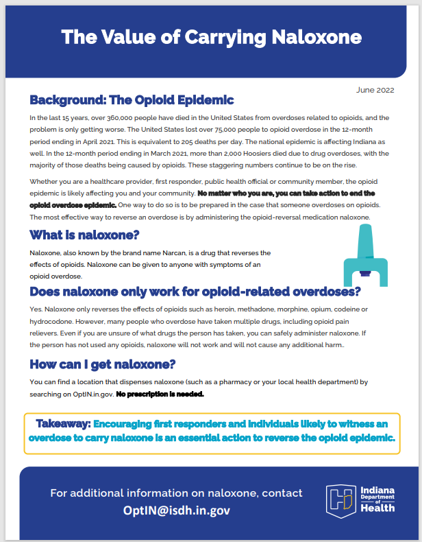 | Information about naloxone and why first responders and individuals likely to witness an opioid overdose should carry naloxone. Source: Division of Trauma and Injury Prevention at the Indiana Department of Health. | |