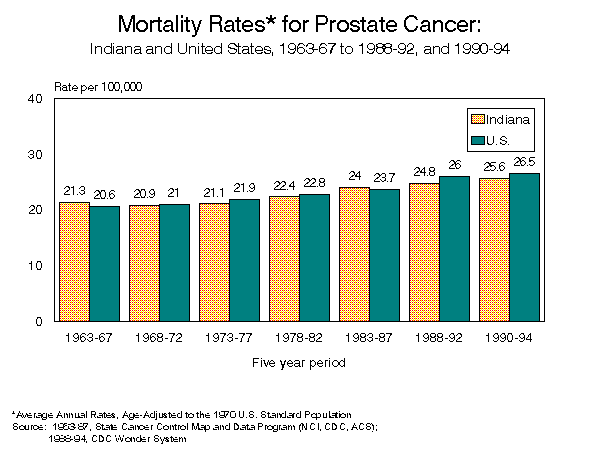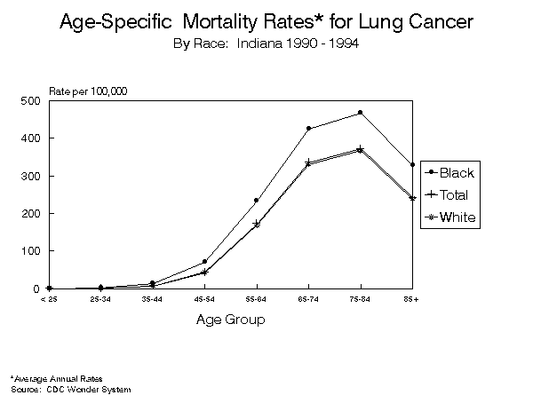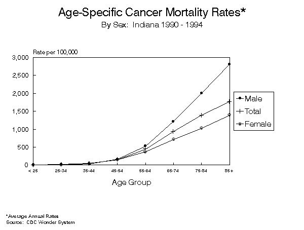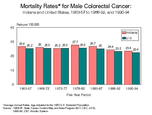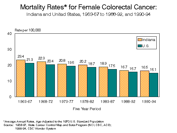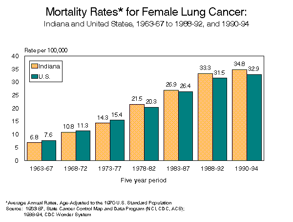 INDIANA CANCER MORTALITY REPORTState and County Data1990 - 1994[an error occurred while processing this directive] Indiana State Department of Health To request a copy of this report, call: (317) 233-7349 PrefaceThe 1990-1994 Indiana Cancer Mortality report summarizes deaths to Indiana residents for which the cause of death was identified as a malignant neoplasm. Both counts of deaths and average annual age-standardized cancer death rates are provided for Indiana, and for each county, by sex and cancer site. Counts and cancer death rates are also provided by sex and race (white and black) for Indiana and for five counties with sufficient minority populations. Age-specific cancer death rates for Indiana are provided for the top four cancer sites. In order to make valid comparisons between rates for different geographic areas, cancer death rates are adjusted to eliminate the effect of differing age distributions among the areas. Rates in this report were standardized using the US 1970 Standard Million Population. The 1970 Standard Million was used rather than the more common 1940 Standard Million to allow for valid comparisons with cancer death rates produced at a national level. The information provided in these tables is intended for health professionals, students, legislators and others interested in the health status of Indiana residents. The intent of this publication is to provide information necessary to assess the changing health status of the community, to develop resources and interventions in areas of need, and to improve the modifiable health risk factors which result in adverse health conditions. Information on each death is provided to the state under the authority of Indiana State Code 16-1-15-5. The cause of death is coded using the International Classification of Disease, Injuries and Cause of Death, Ninth Revision (ICD-9). Codes from 140.0 through 208.9 identify malignant neoplasms. INDIANA STATE DEPARTMENT OF HEALTHRichard D. Feldman, M.D., State Health Commissioner Operational Services CommissionD. Peter Maniago, Assistant Commissioner Epidemiology Resource CenterGregory K. Steele, Dr.P.H., Director Data Analysis TeamRoland E. Gamache, Ph.D., M.B.A., Director Contributing StaffJeanne Moorman, M.S. TABLE OF CONTENTSHighlights Known Cancer Risk Factors Suspected Cancer Risk Factors LIST OF FIGURES