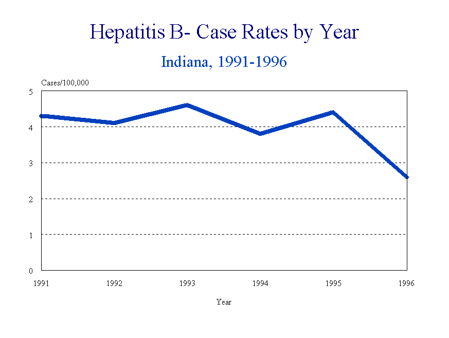 In 1996, there was a sharp decrease in reported cases of acute hepatitis B and there were no deaths. Hepatitis B-1 shows the case rate since 1991. Prior to this year, the rate of infection had remained stable through the 1990s.