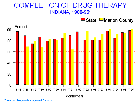 The top priority of TB control efforts is to ensure completion of therapy after a patient is diagnosed with TB and therapy is initiated. The objective is to have at least 90% of the patients complete adequate and appropriate therapy within twelve months. Because completion data are gathered at the end of therapy, the current data are for those individuals who started therapy in 1995. During the first half of 1995, the state index was 94.1% and Marion County was 93.3%. For the second half of the year, the state index increased to 97.7% and Marion County to 100% (