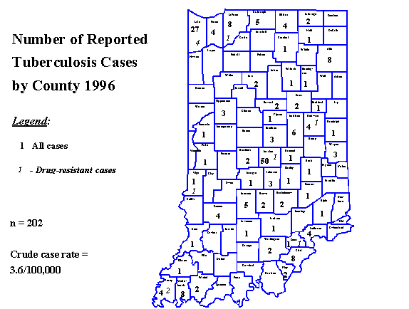 During 1996, Indiana reported 202 new cases of tuberculosis for a state case rate of 3.6 cases per 100,000 population. This number was not a significant increase over the 199 reported cases the previous year. TB was reported in 50 of the 92 Indiana counties; higher numbers were reported by more densely populated counties.