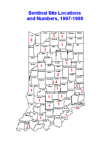Influenza surveillance during the 1997-98 influenza season was conducted in cooperation with the Centers for Disease Control and Prevention (CDC). ISDH participated in a pilot project with CDC and 30 other states to gather data on " influenza-like illness" morbidity and to identify influenza virus strains responsible for disease. Thirty physicians, nurse-managed clinics, and university health centers across the state volunteered to be sentinel sites. Their locations and number per county are identified in Figure 1.