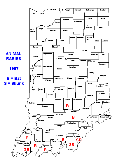 = 13 (9 bats, 4 skunks)Although human rabies is quite rare in Indiana (last case in 1959), it nevertheless is of great public health interest. Out of 2,103 animals tested in 1997 by the ISDH Disease Control Laboratory, 13 were rabies-positive. The most commonly tested species included dogs (737), cats (648), bats (215), and raccoons (214). Nine of the rabies-positive animals were bats, and four were skunks. The counties of origin are shown in Figure 1.