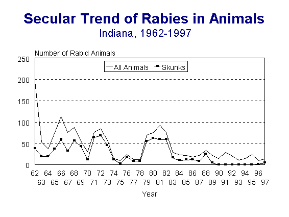 Historically, the skunk has been the major terrestrial rabies reservoir in Indiana (Figure 2). Since 1962, approximately 58% (819/1424) of the animal rabies cases have been in this species. Skunk rabies activity tends to fluctuate in Indiana in 6 to 8-year cycles. However, since 1990, there have been only 5 rabid skunks diagnosed in Indiana. Skunk rabies remains a problem in surrounding states, however.