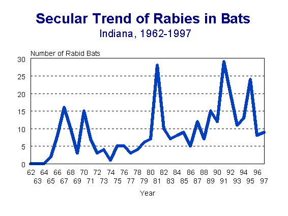 The number of rabid bats diagnosed in Indiana also undergoes cyclic fluctuations (Figure 3). Eight bat rabies ecotypes (strains) have been identified in the United States. Six of these are known to be circulating in Indiana. Nationally, almost all of the human rabies deaths in the last several years have been caused by one of the bat ecotypes. Often the victim had no known bat bite and in some cases no known bat contact. Thus, any contact or potential contact with an untested bat should be evaluated very carefully.