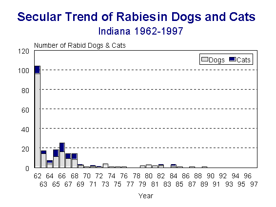 The number of rabid cats and dogs has declined markedly in the past 25 years (Figure 4). The last rabid dog and cat in Indiana were diagnosed in 1989 and 1984, respectively. Domestic animals in Indiana become infected primarily through exposure to rabid wildlife. Therefore, both dogs and cats should be vaccinated against rabies, as required by state law. Immunization of farm species is not indicated at present in Indiana.