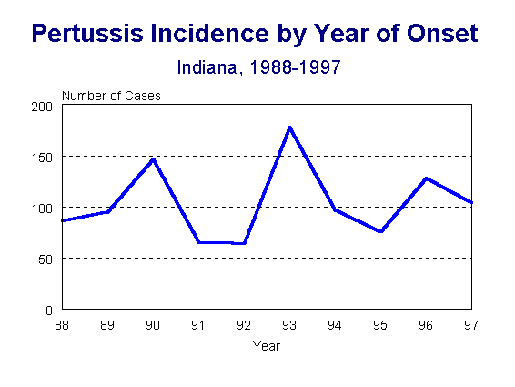 = 104For the second consecutive year there were over 100 cases of pertussis reported. This is the third time since 1993 that over 100 cases have been reported. In the seven years prior to 1993, 100 cases or more had been reported in only one year (1990). In the past five years (1993-97), 583 (mean=117) cases of pertussis have been reported in Indiana. In the five years previous to that period (1988-92), 458 (mean=92) cases were reported. This increased incidence in Indiana follows a national trend in pertussis occurrence. Over 6,000 cases of pertussis were reported nationally in 1996 and 1993; these two years represent the highest incidence of pertussis since 1967. Figure 1 depicts the annual incidence of pertussis for the past ten years.