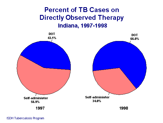Besides drug resistance, non-compliance is another major reason for having to extend the treatment period. The most effective method to assure the patient is complying with the prescribed regimen is to use Directly Observed Therapy (DOT). DOT is a strategy proven to ensure completion of therapy, thereby preventing the emergence of acquired drug resistance. DOT should be considered for all TB patients. Every effort must be made to initiate DOT when the patient is first started on anti-TB medications, especially pulmonary and drug resistant cases. During 1998, 66.0% (122/188) of all cases were on DOT for some portion of the treatment period (Figure 9).