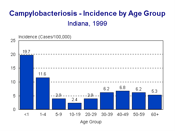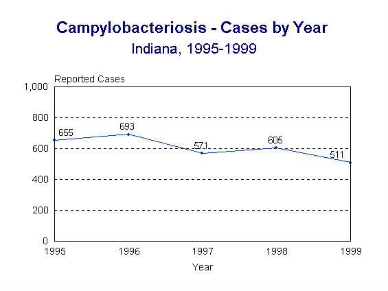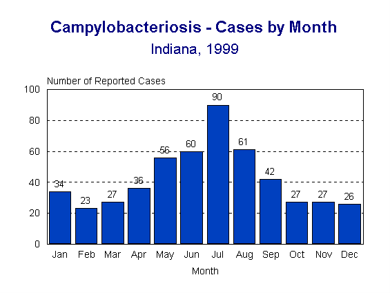 There were 511 cases of campylobacteriosis reported in Indiana in 1999, which represents a decrease from previous years (Figure 1). Incidence of disease was greatest during the summer months, as shown in Figure 2.