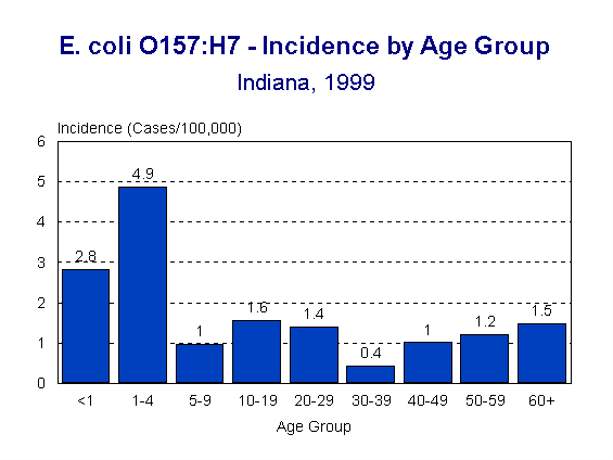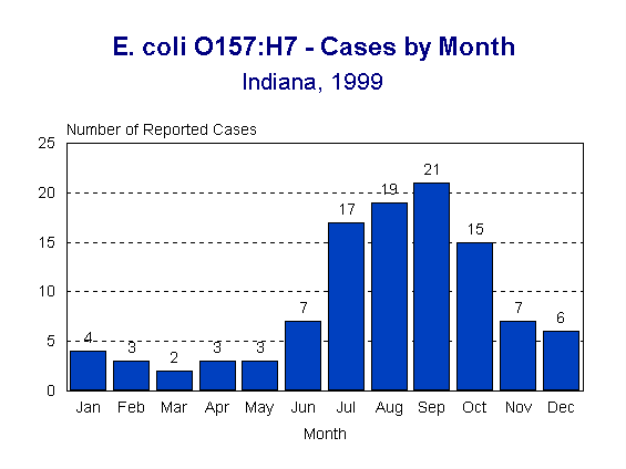 There were 107 cases of E. coli O157:H7 reported in Indiana in 1999, which marks an 18% increase from the previous year (Figure 1). Incidence of disease was greatest during the summer and early fall months, as seen in Figure 2.